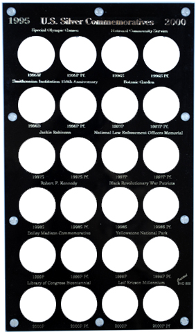 Capital Plastics offers the largest selection of premium coin holders of any available brand. This holder has holes for the modern half dollar and dollar commemorative coins issued from 1995 to 2000. Sized to fit inside a bank vault drawer.