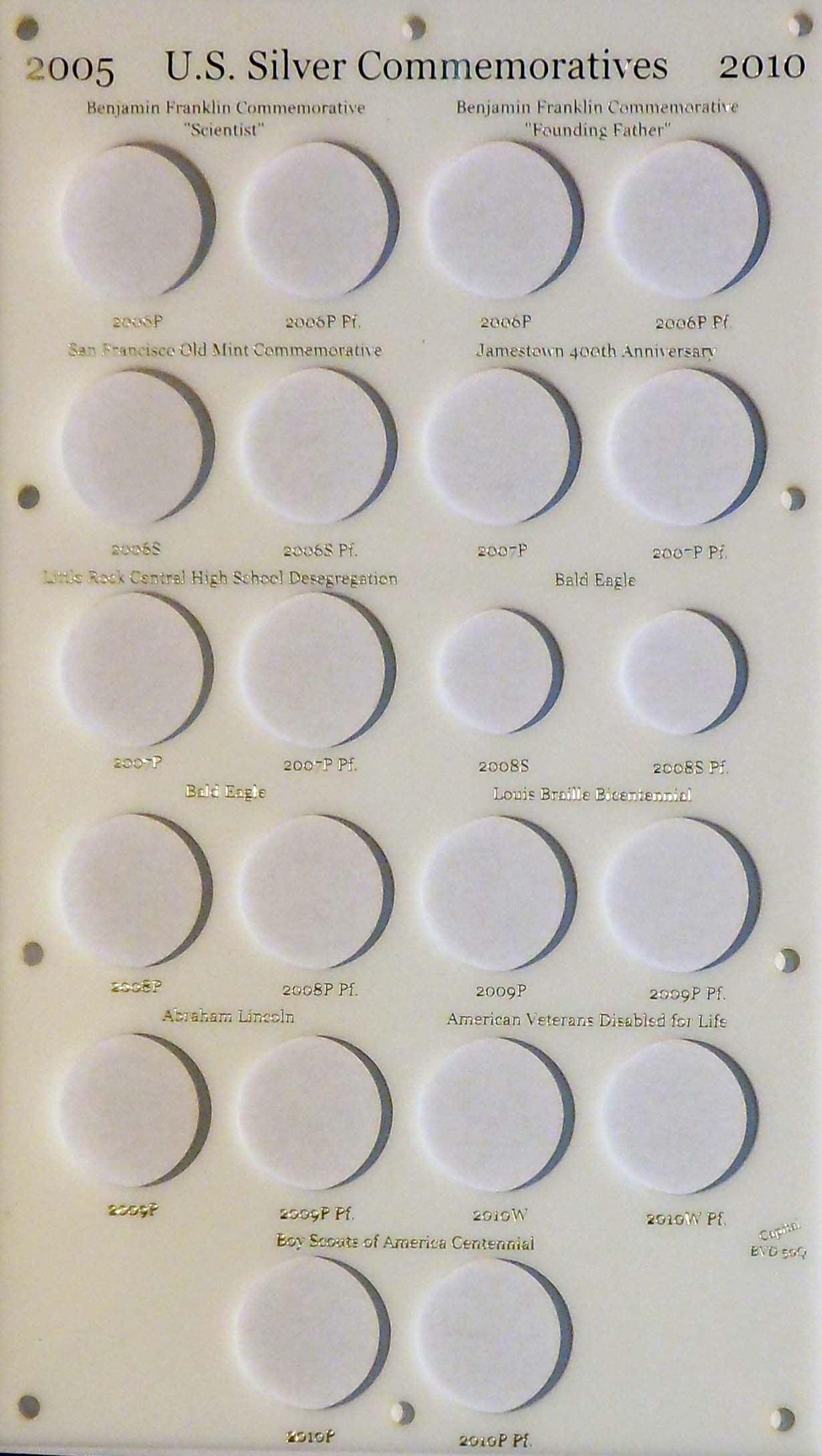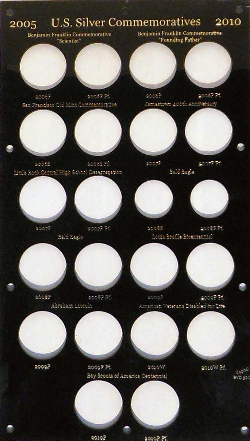 Capital Plastics offers the largest selection of premium coin holders of any available brand. This holder has holes for the modern half dollar and dollar commemorative coins issued from 2005 to 2010. Sized to fit inside a bank vault drawer.