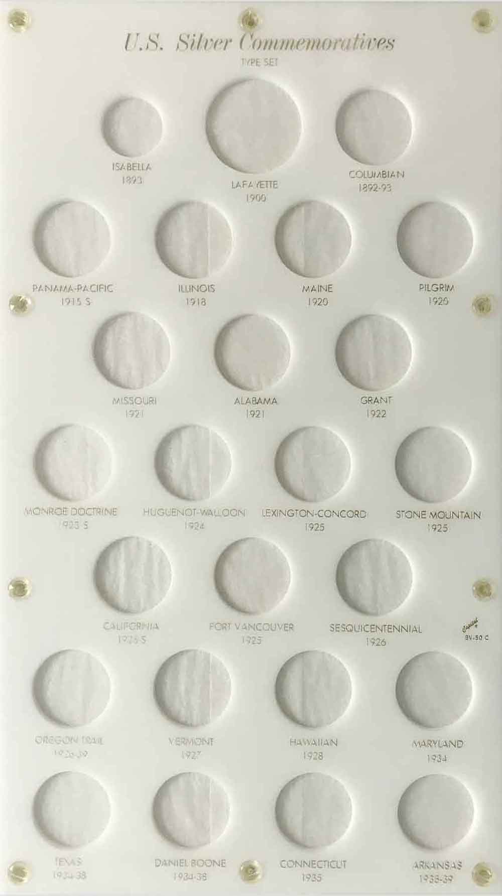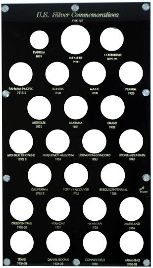 Capital Plastics offers the largest selection of premium coin holders of any available brand. This holder has 25 holes for the classic commemorative coins issued from 1893 to 1939 including 23 half dollars plus the Lafayette Dollar and Isabella Quarter. Sized to fit inside a bank vault drawer.
