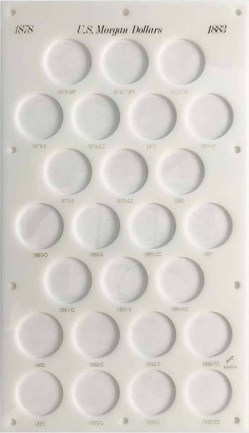 Capital Plastics offers the largest selection of premium coin holders of any available brand. This holder has 25 holes for Morgan Dollars dated from 1878 to 1883-CC. Sized to fit inside a bank vault drawer.