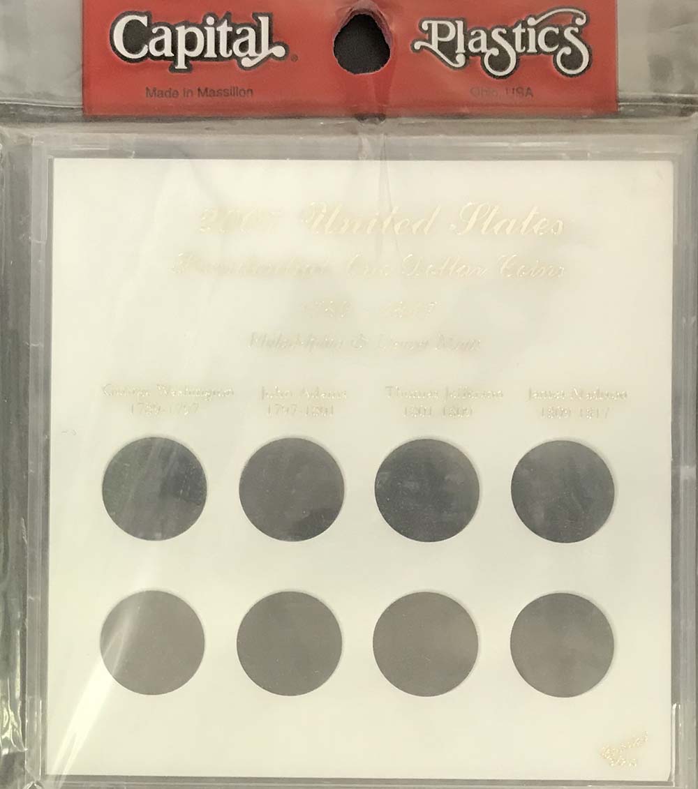 Capital Plastics offers the largest selection of premium coin holders of any available brand. This is Capital's Galaxy style snap together holder with eight holes for P-mint and D-mint versions of the Presidential Dollars issued in 2007.