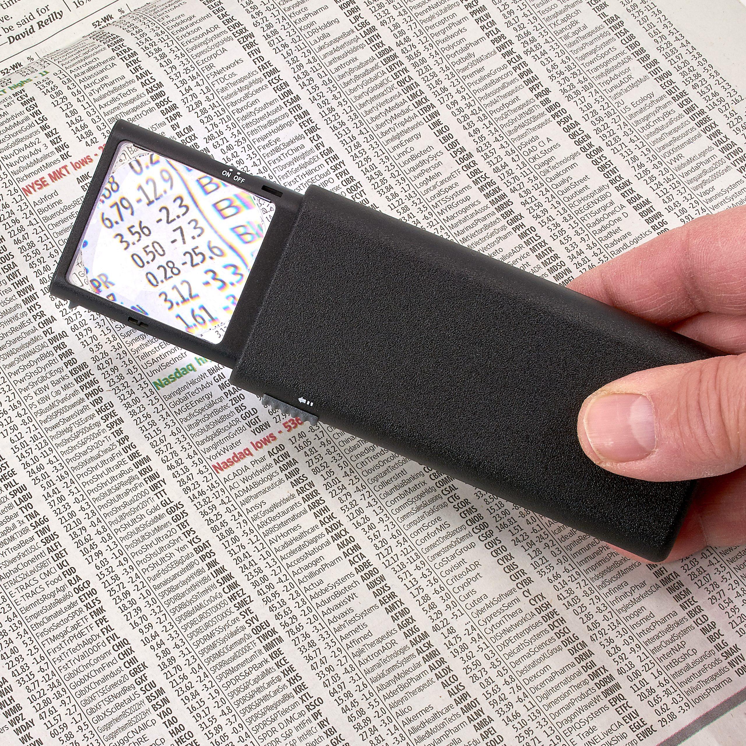 The LP-66, LumiPop pocket magnifier is a compact, 5x power, slide-out magnifier with a protective snap-out plastic case. It boasts a crystal-clear aspheric, acrylic lens. Aspheric lenses provide a clear image with no blurring and little to no distortion. Perfect for reading small type in low light! It has a convenient on/off switch that powers the super bright LED Lights. The LumiPop pocket magnifier is compact enough to fit in your shirt pocket.