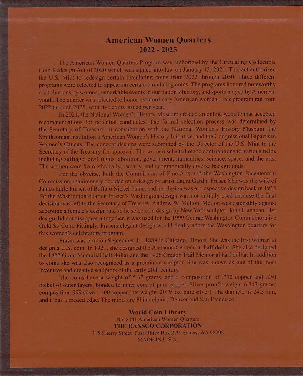 This Dansco Supreme Album for American Women Quarters 2022-2025, PDSS (Dansco model number 8141) consists of a brown leatherette binder with loose-leaf hinged pages. The binder is gold stamped and the plastic coated pages are tan in color with black lettering. The pages are held in the binder with two posts that screw apart so that pages can be added, removed and replaced with ease. If a slip case is desired, the 3/4 inch slip case is the proper size for this album. The album has 4 pages with each page covering one year of releases and featuring the five honorees for a the year. There are four ports for each honoree (P, D and S-mint circulation strike coins and S-mint proofs).