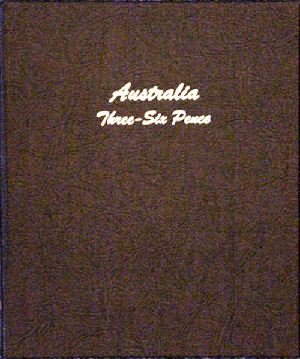 This Dansco Supreme Album for Australia 3p-6p 1910-1954 (Dansco model number 7332) consists of a brown leatherette binder with loose-leaf hinged pages. The binder is gold stamped and the plastic coated pages are tan in color with black lettering. The pages are held in the binder with two posts that screw apart so that pages can be added, removed and replaced with ease. If a slip case is desired, the 3/4 inch slip case is the proper size for this album.