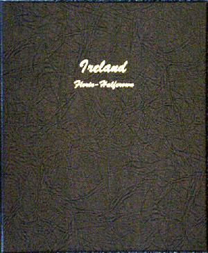 This Dansco Supreme Album for Ireland Florin-Half Crowns (Dansco model number 7373) consists of a brown leatherette binder with loose-leaf hinged pages. The binder is gold stamped and the plastic coated pages are tan in color with black lettering. The pages are held in the binder with two posts that screw apart so that pages can be added, removed and replaced with ease. If a slip case is desired, the 3/4 inch slip case is the proper size for this album.