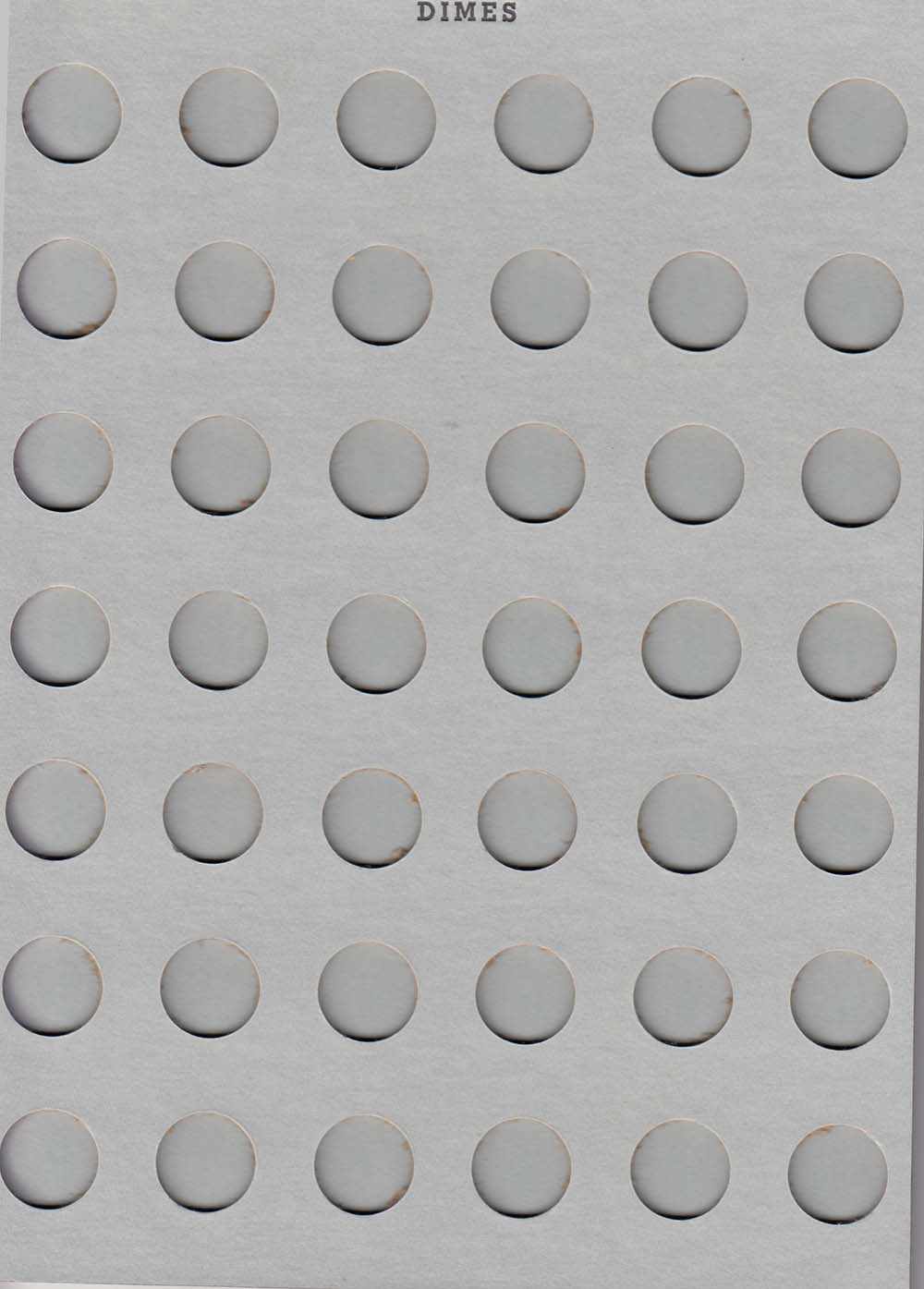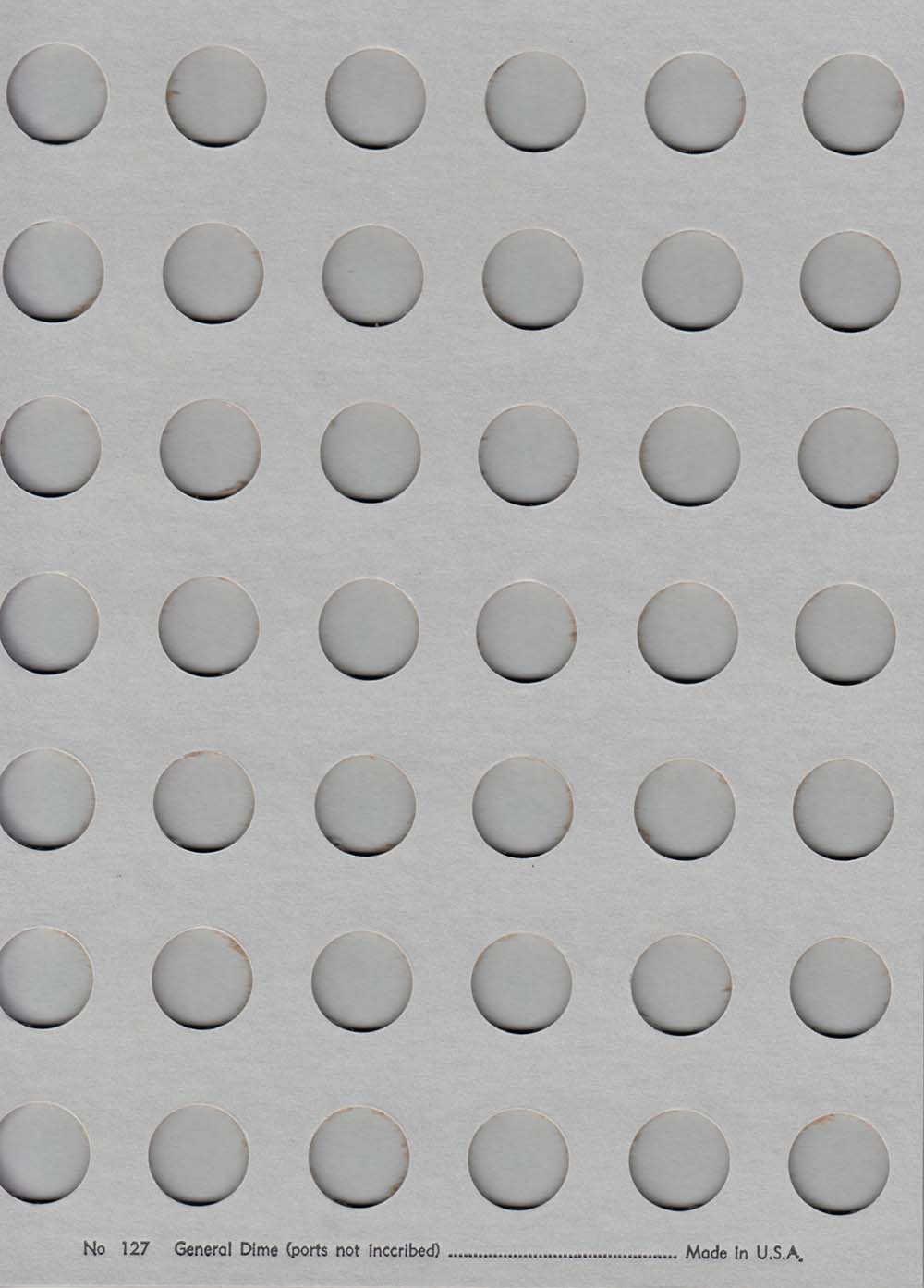 This two-panel folder has space for 42 dimes on each page for a total of 84. These Dansco "all-in-one" folders fold into a compact book shelf size measuring 6 1/2 inches by 9 1/4 inches. These folders are of a lie-flat construction making it easy to insert coins into the ports. They open out to allow inspection or display of your coins from the beginning to the end without having to turn pages. They are bound in brown simulated leather, beautifully gold stamped to furnish a truly luxurious setting for your coin collection. Ports are the exact size of the coin, holding the coin securely by friction. Ports are inscribed with the year, mint and number of millions of coins minted.