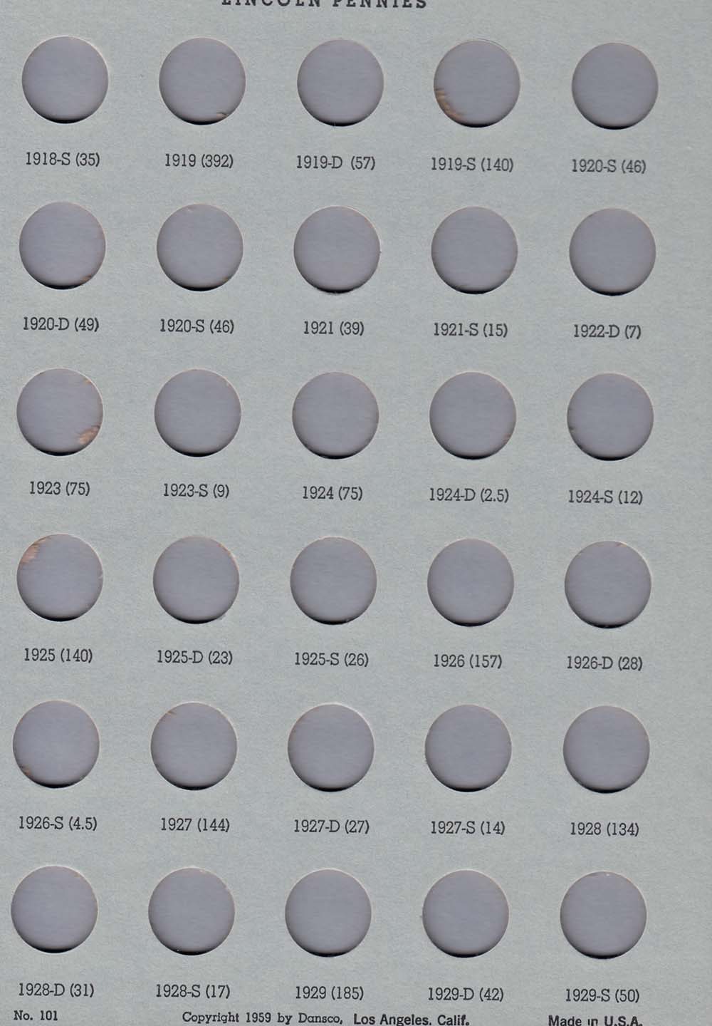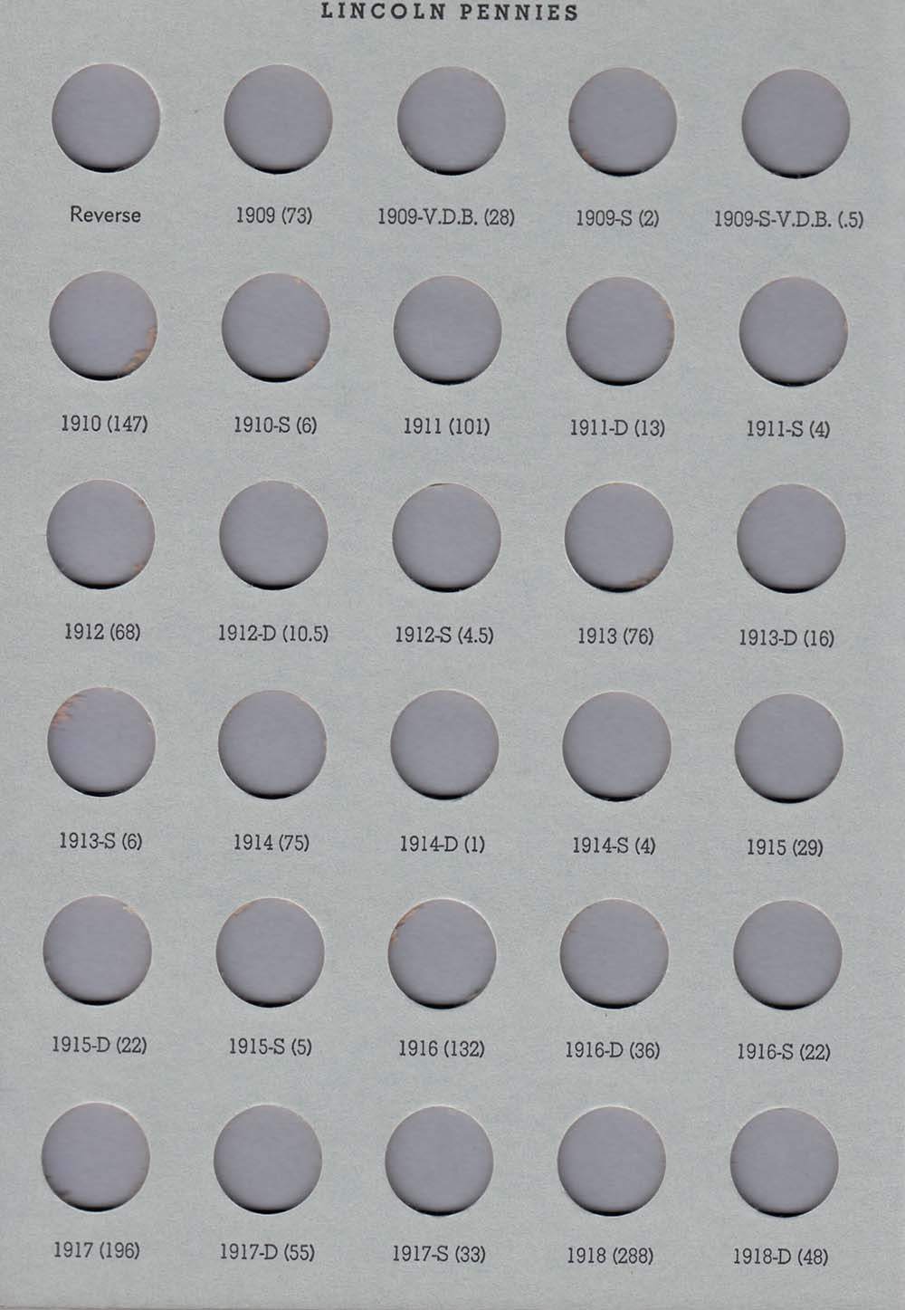 This two-panel folder holds Lincoln Cents from 1909 to 1929-S. These Dansco "all-in-one" folders fold into a compact book shelf size measuring 6 1/2 inches by 9 1/4 inches. These folders are of a lie-flat construction making it easy to insert coins into the ports. They open out to allow inspection or display of your coins from the beginning to the end without having to turn pages. They are bound in brown simulated leather, beautifully gold stamped to furnish a truly luxurious setting for your coin collection. Ports are the exact size of the coin, holding the coin securely by friction. Ports are inscribed with the year, mint and number of millions of coins minted.