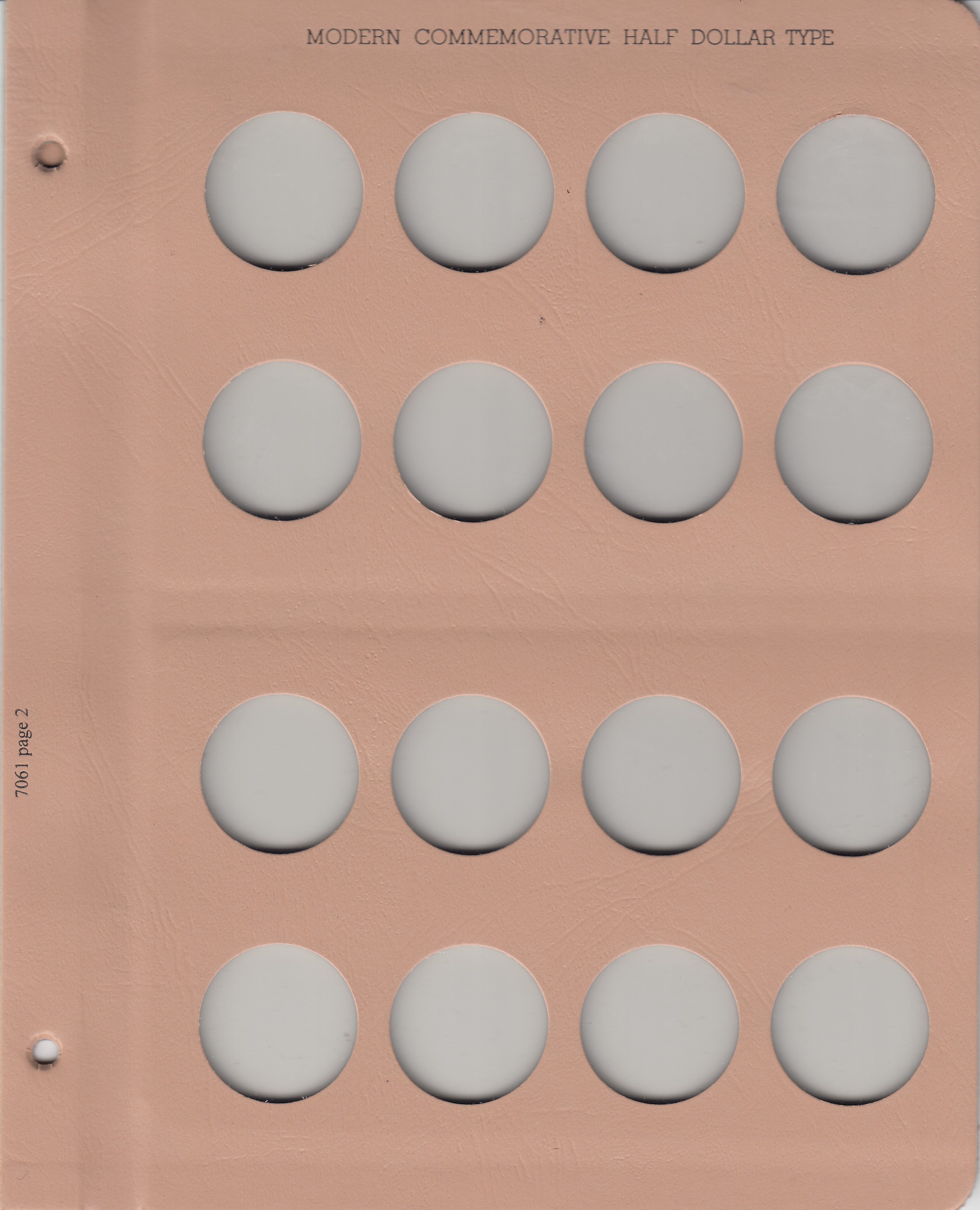 When there isn't a Dansco album that perfectly fits your collecting needs, make your own album using Dansco Blank Binders and Dansco Blank and Extra Pages. This page is labeled "Modern Commemorative Half Dollar Type" at the top of the page while the individual ports are unlabeled.