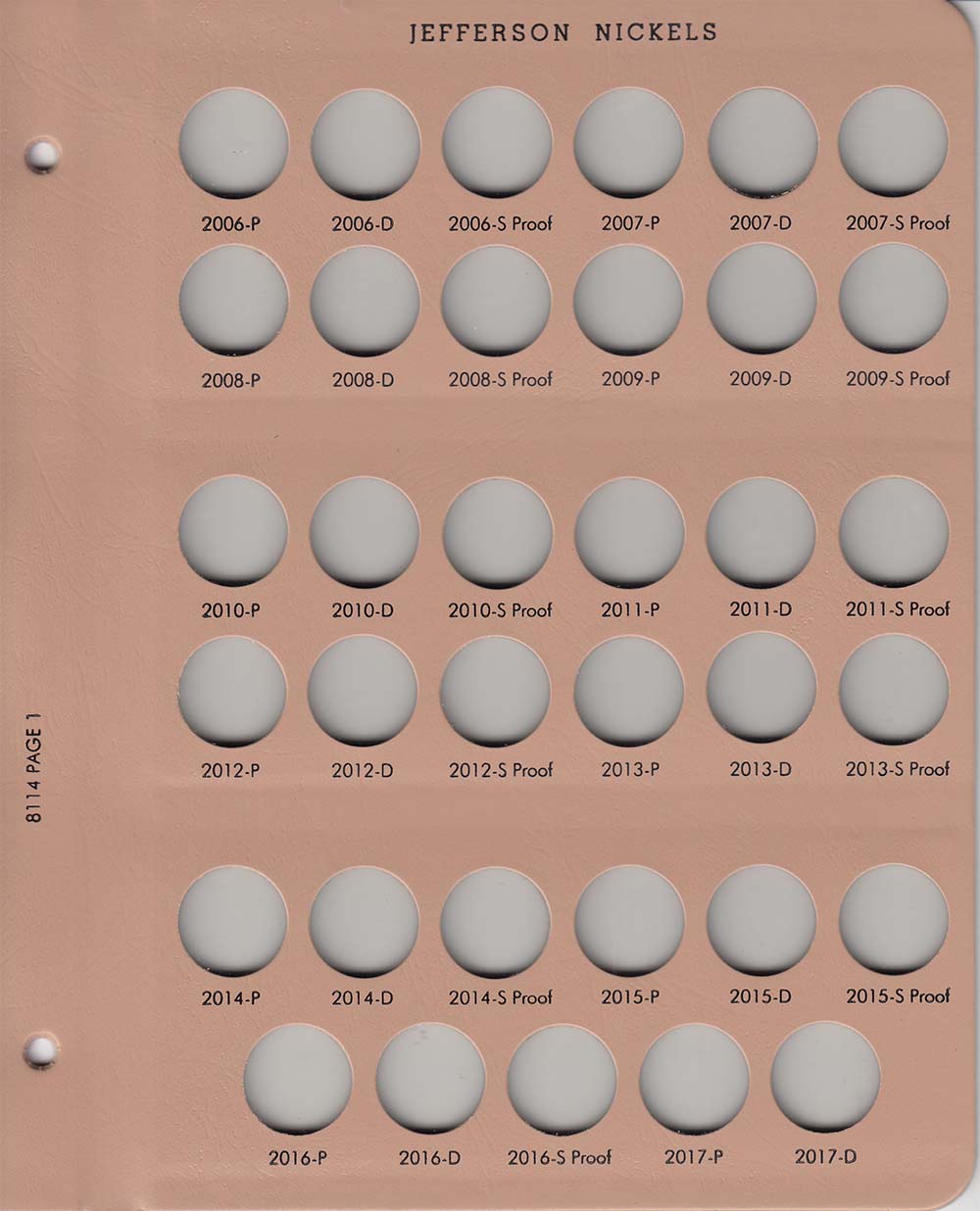 Dansco Replacement pages are used to update older versions of albums or replace worn pages. This page is page 1 of the Jefferson Nickels w/ Proof album (Dansco model 8114). This page starts with 2006-P.