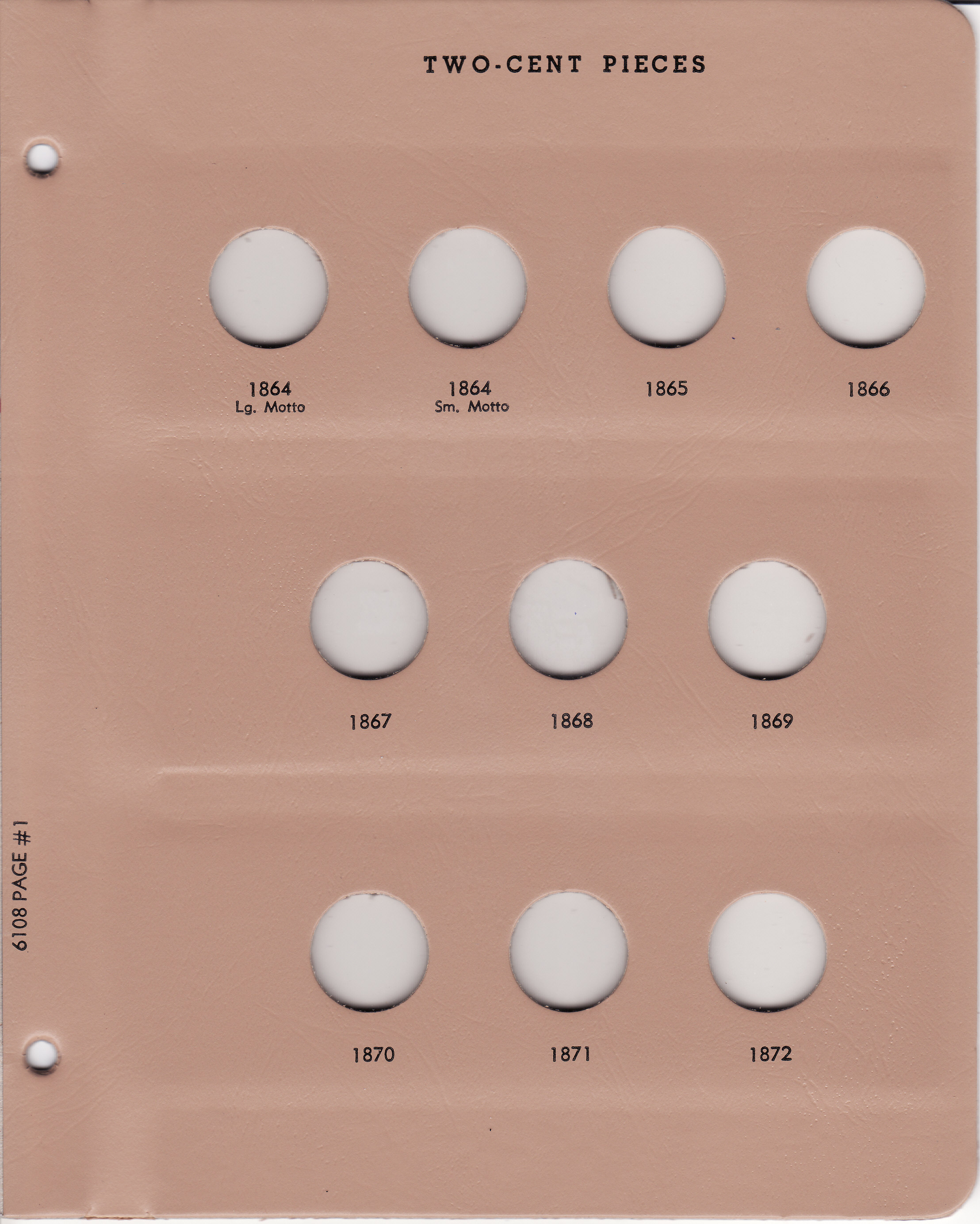 Dansco Replacement pages are used to update older versions of albums or replace worn pages. This page holds Two Cent Pieces from 1864 to 1872 and replaces page 1 in Dansco Album 6108: 2c Pieces and Nickel 3c Pieces.