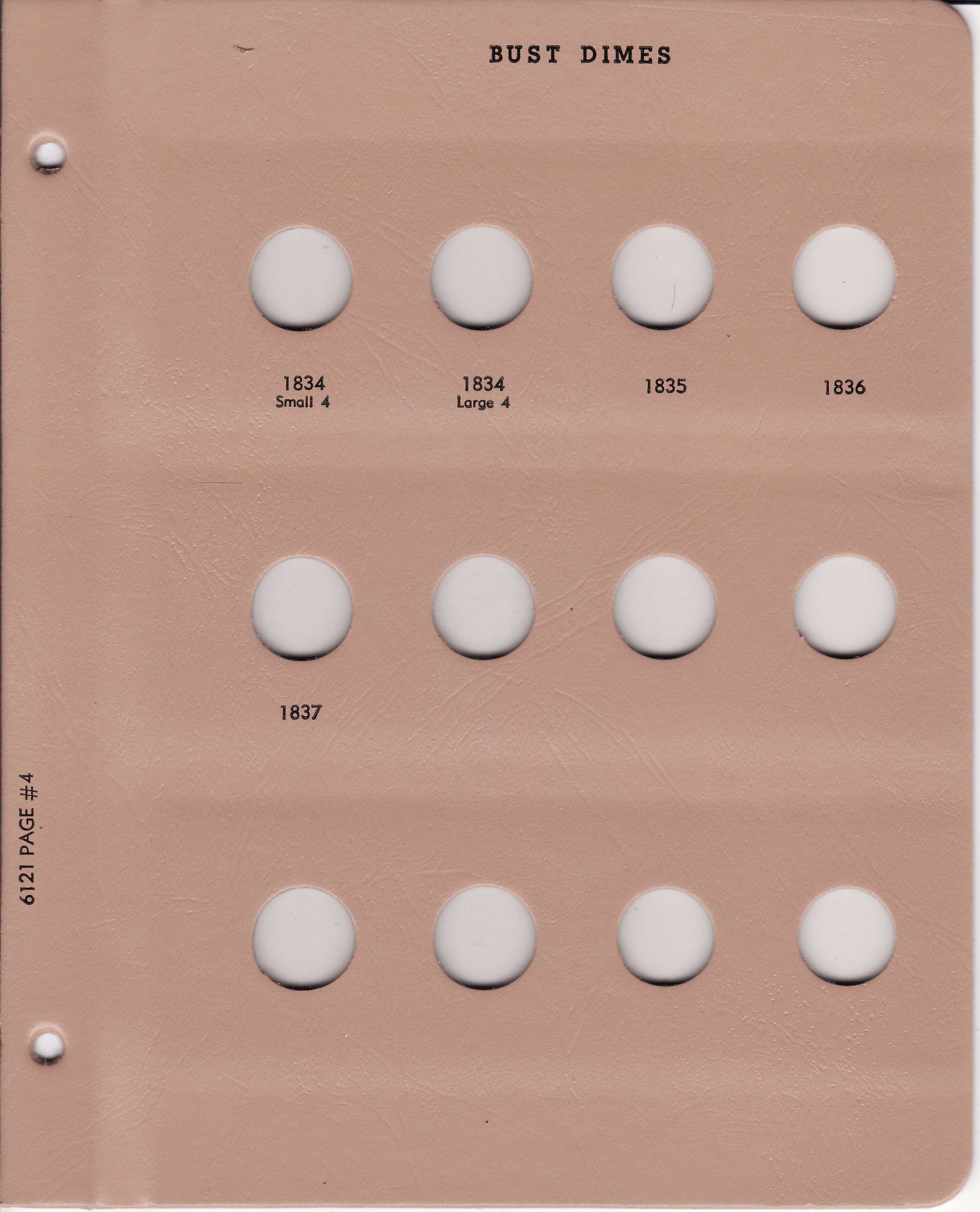 Dansco Replacement pages are used to update older versions of albums or replace worn pages. This page holds Bust Dimes from 1834 to 1837 and replaces page 4 in Dansco Album 6121: Bust Dimes, 1796-1837.