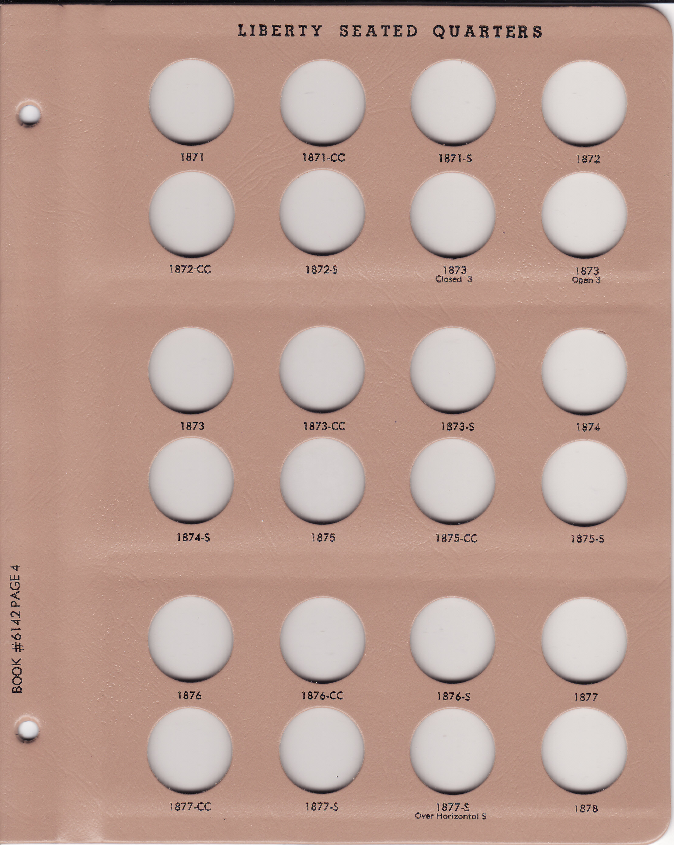 Dansco Replacement pages are used to update older versions of albums or replace worn pages. This page holds Liberty Seated Quarters from 1871 to 1878 and replaces page 4 in Dansco Album 6142: Liberty Seated Quarters, 1838-1891.