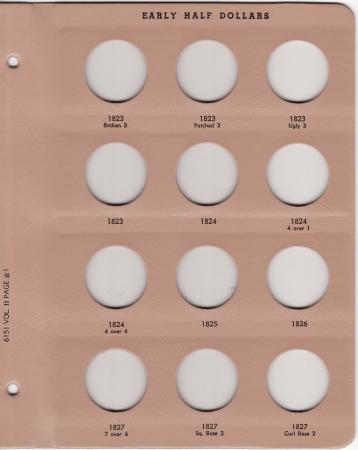 Dansco Replacement pages are used to update older versions of albums or replace worn pages. This page is page 1 of volume 2 of the two volume Early Half Dollars album (Dansco model 6151) for Early Half Dollars from 1823 to 1827.