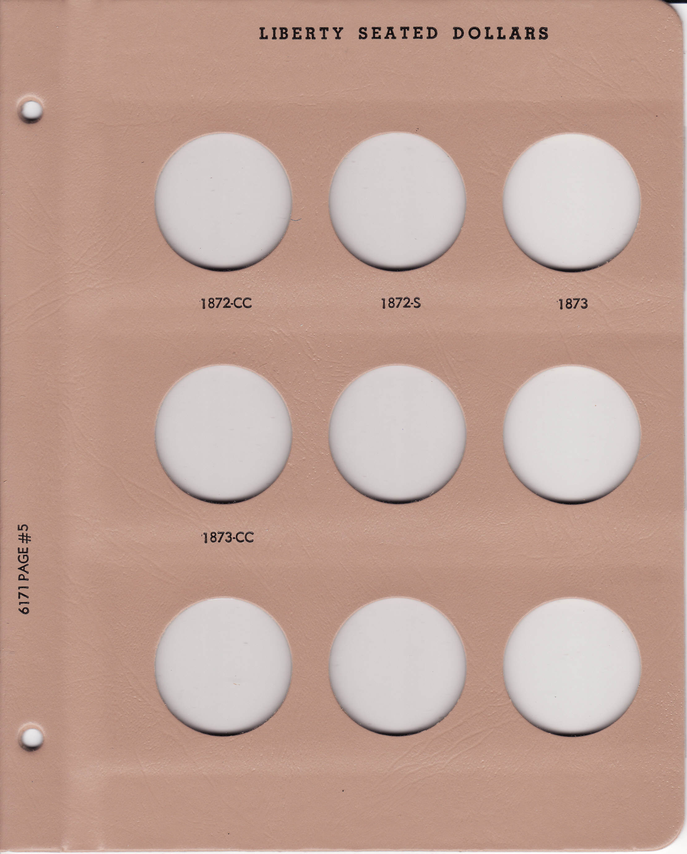 Dansco Replacement pages are used to update older versions of albums or replace worn pages. This page holds Liberty Seated Dollars from 1872-CC to 1873-CC and replaces page 5 in Dansco Album 6171: Liberty Seated Dollars, 1840-1873.