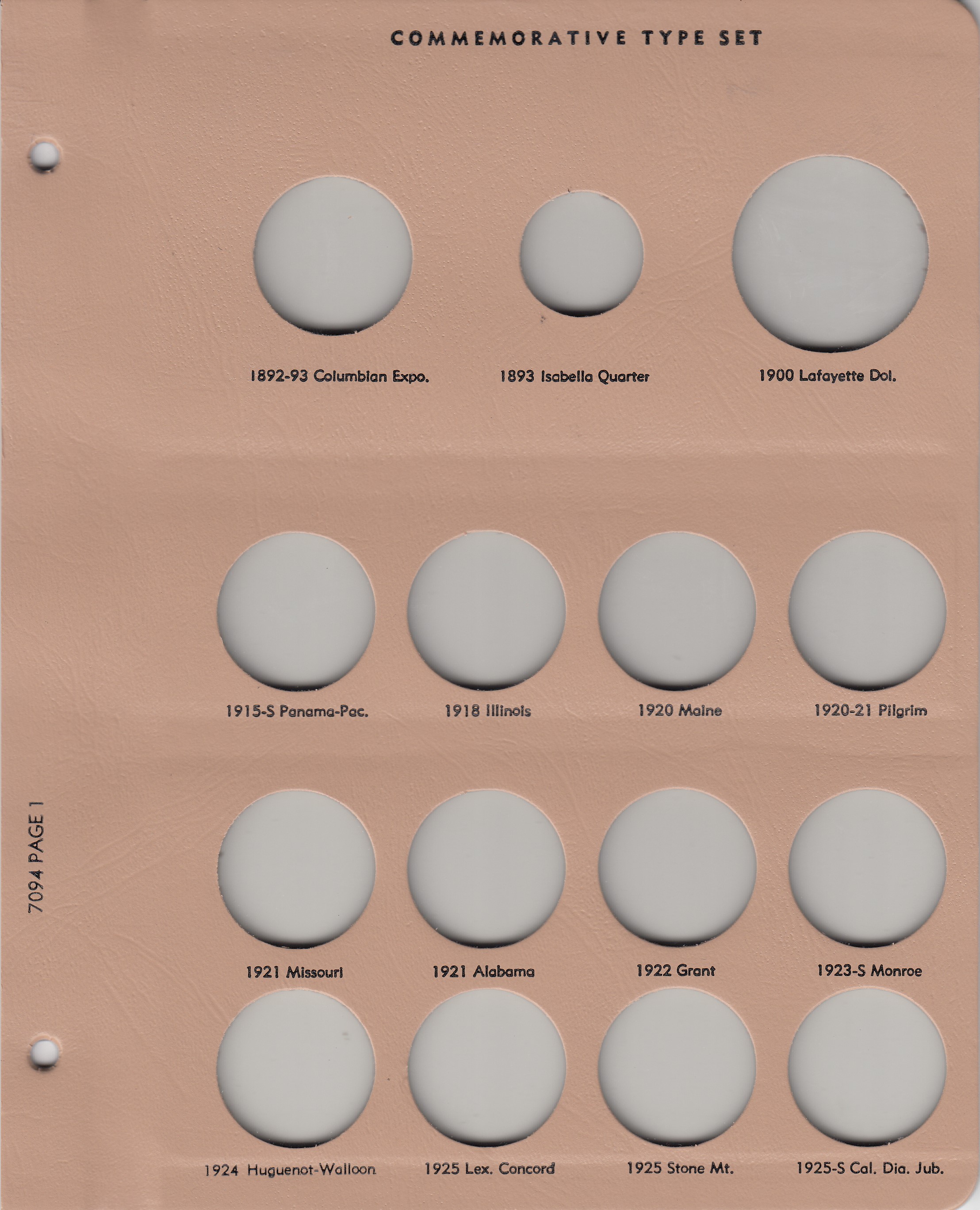 Dansco Replacement pages are used to update older versions of albums or replace worn pages. This page holds Classic Commemorative Type (one coin per design) from 1892 to 1925 and replaces page 1 in Dansco Album 7094: US (Classic) Commemorative Type Set, 1893-1954.