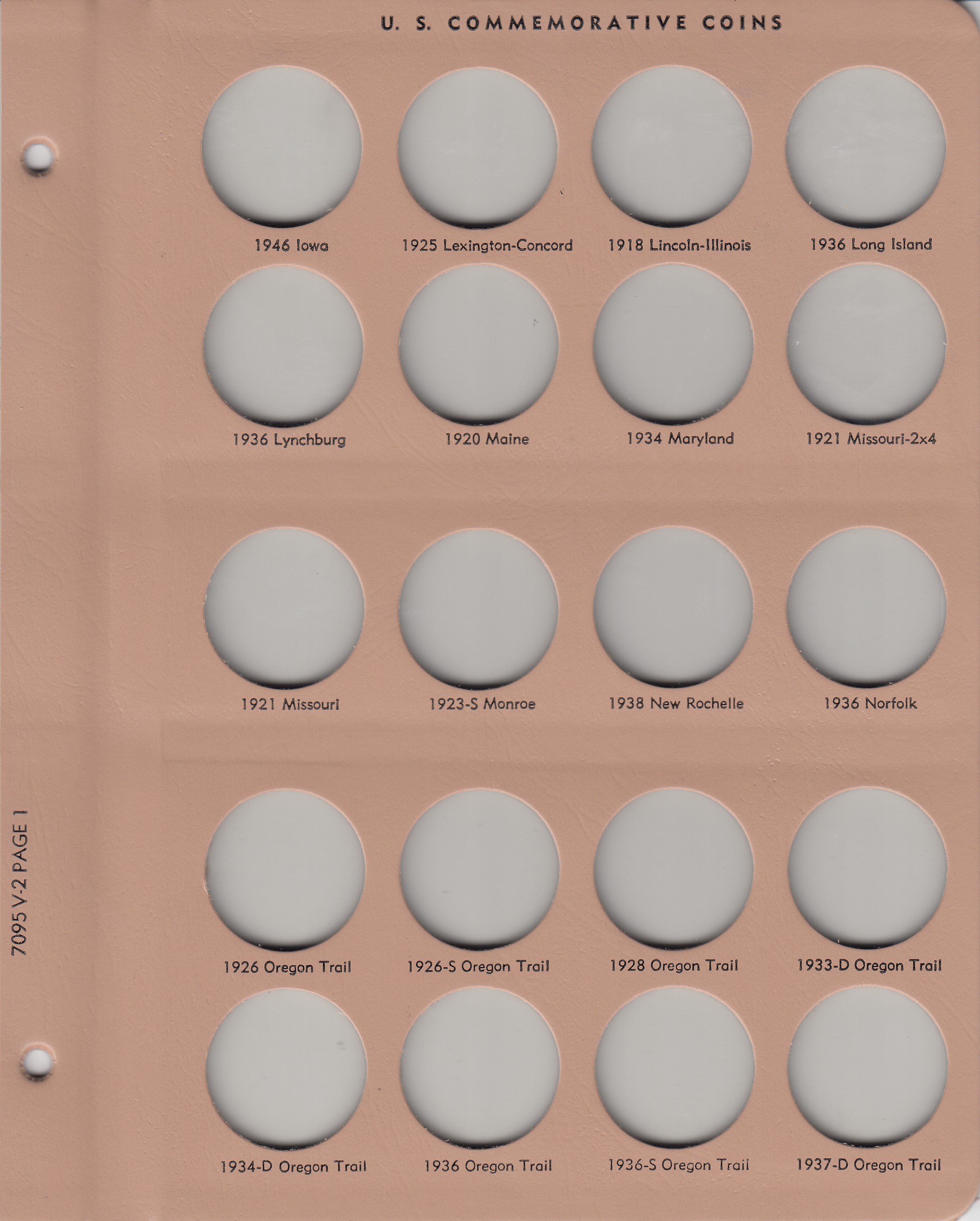 Dansco Replacement pages are used to update older versions of albums or replace worn pages. This page holds Classic Commemoratives from 1946 Iowa to 1937-D Oregon Trail and replaces page 1 in Volume 2 of Dansco Album 7095: US (Classic) Commemoratives Complete Set (Vol 1&2), 1893-1954.