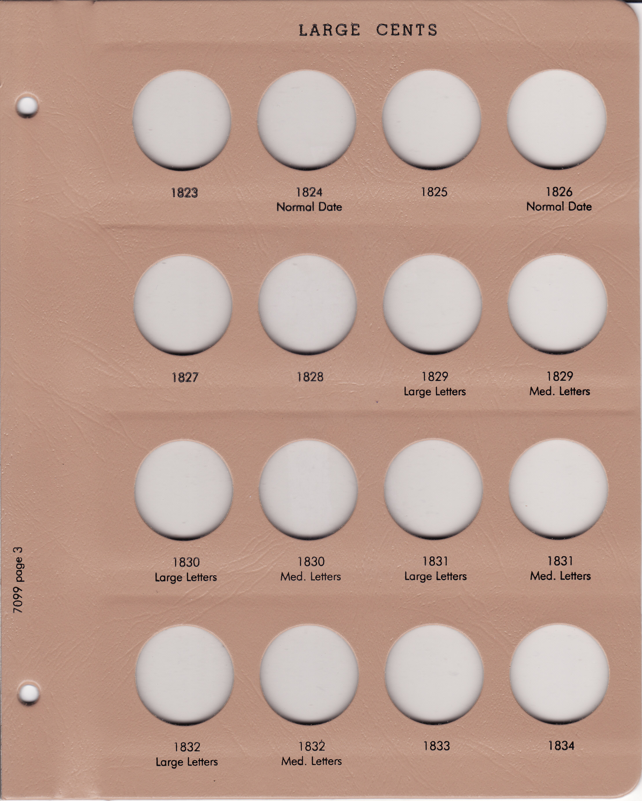 Dansco Replacement pages are used to update older versions of albums or replace worn pages. This page holds Large Cents from 1823 to 1834 and replaces page 3 in Dansco Album 7099: Large Cents, 1793-1857.
