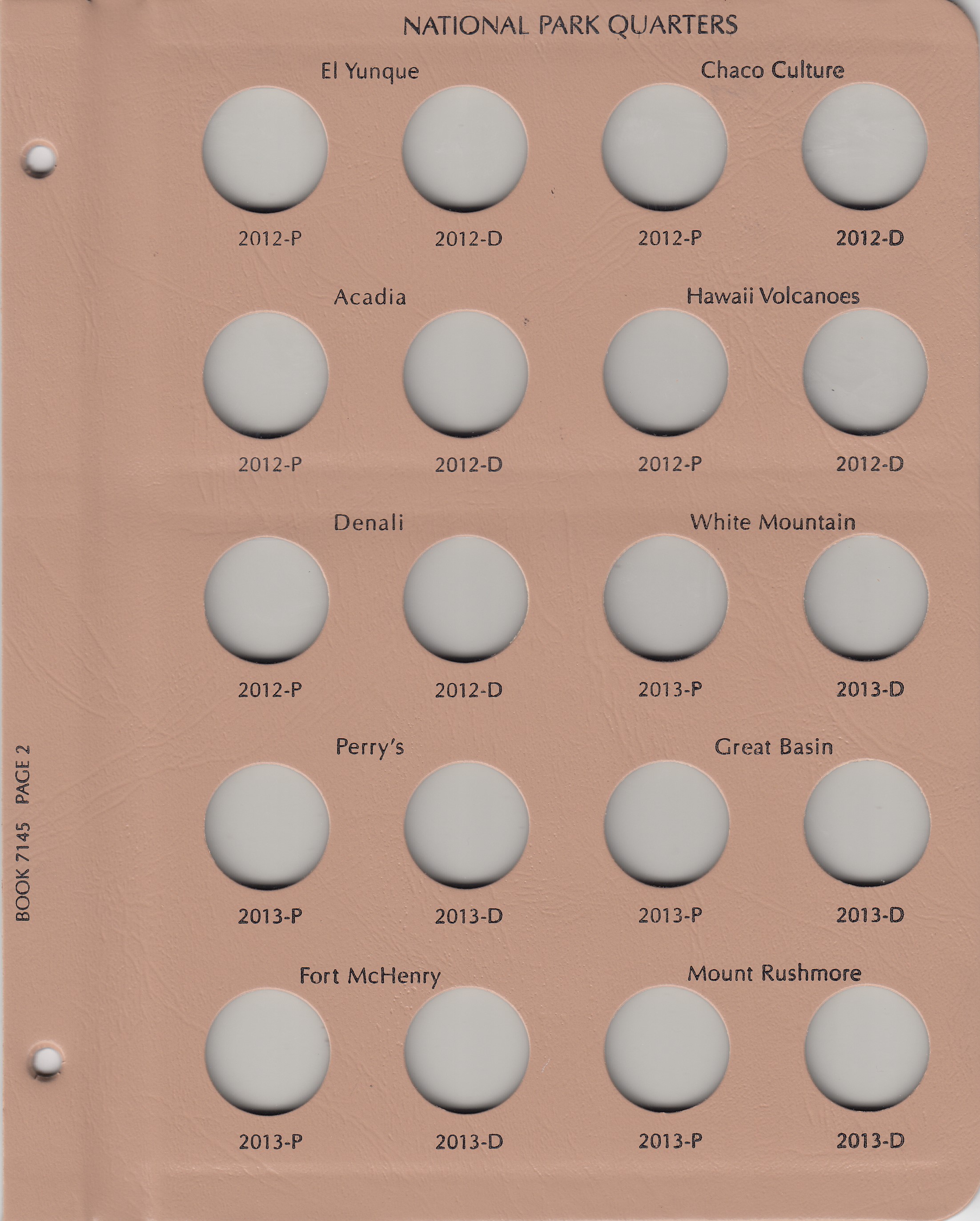 Dansco Replacement pages are used to update older versions of albums or replace worn pages. This page holds National Park Quarters from 2012-2013 and replaces page 2 in Dansco Album 7145: National Parks Quarters P&D, 2010-2021.