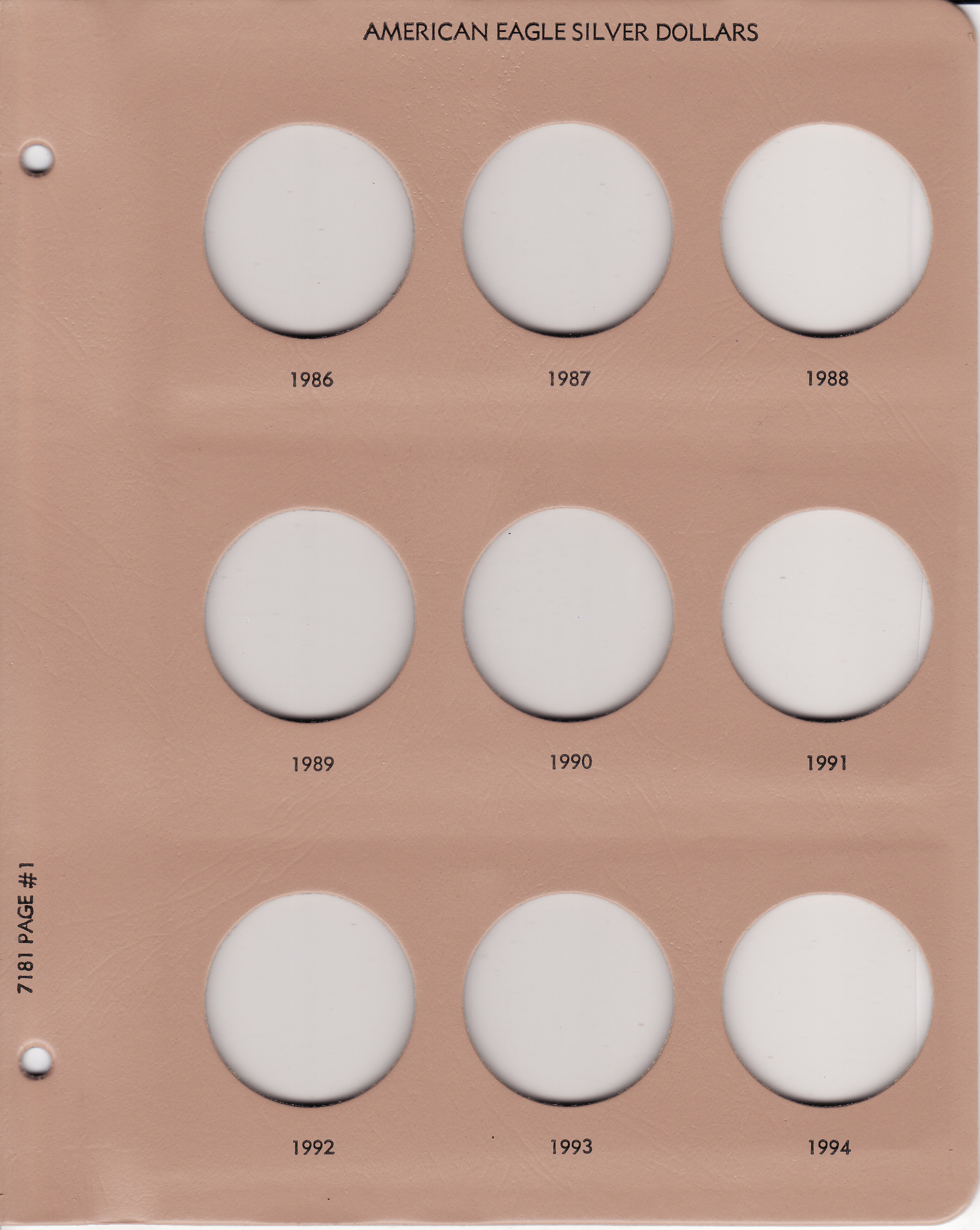Dansco Replacement pages are used to update older versions of albums or replace worn pages. This page holds American Silver Eagle Dollars from 1986 to 1994 and replaces page 1 in Dansco Album 7181: American Eagle Silver Dollars 1986-Date.