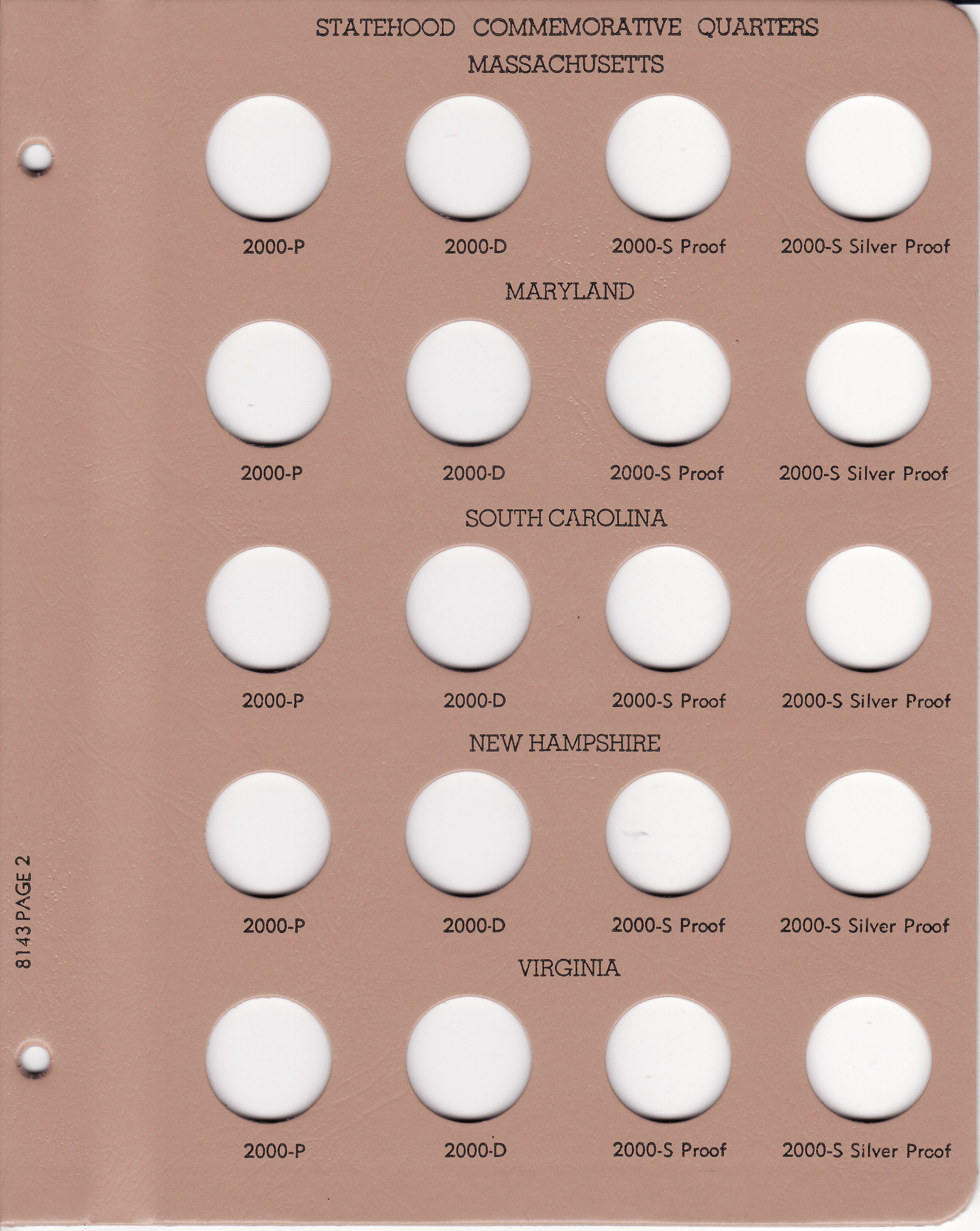 Dansco Replacement pages are used to update older versions of albums or replace worn pages. This page holds Statehood Quarters from 2000 and replaces page 2 in Dansco Album 8143: Statehood Quarters w/ Proofs, 1999-2003. The page has 20 ports for coins from Philadelphia (P mintmark), Denver (D mintmark) and two proof coins from San Fransico (S mintmark clad and S mintmark silver proofs) for each of the five states honored on the 2000 Statehood Quarters (Massachusetts, Maryland, South Carolina, New Hampshire and Virginia).