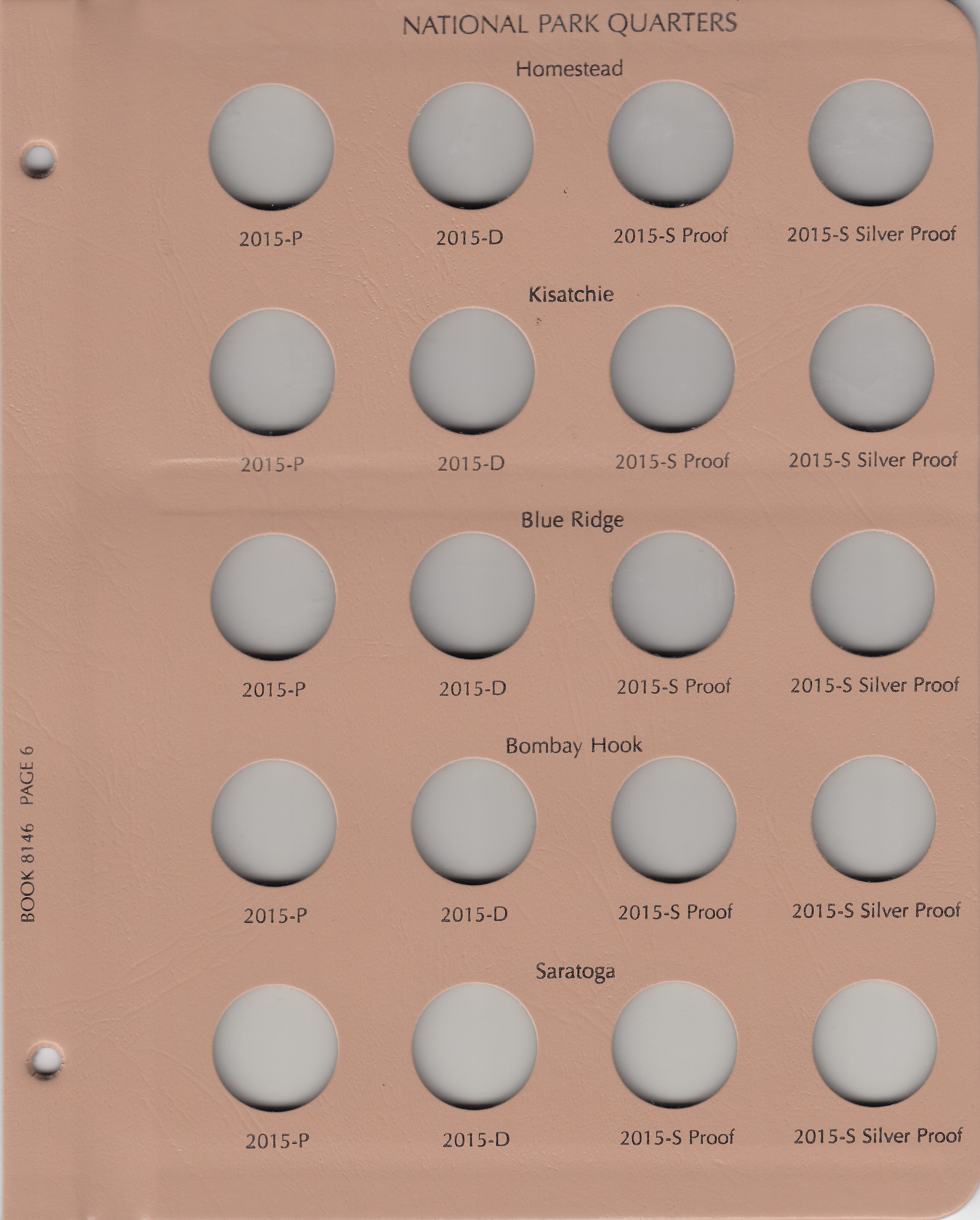 Dansco Replacement pages are used to update older versions of albums or replace worn pages. This page holds National Park Quarters from 2015 and replaces page 6 in Dansco Album 8146: National Parks Quarters w/ Proofs, 2010-2015.