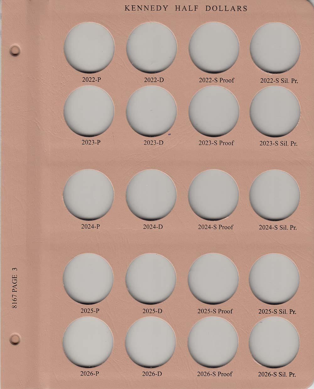 Dansco Replacement pages are used to update older versions of albums or replace worn pages. This page is page 3 of the Kennedy Half Dollars w/ Proof album (Dansco model 8167) with ports for Kennedy halves issued from 2022 to 2026.