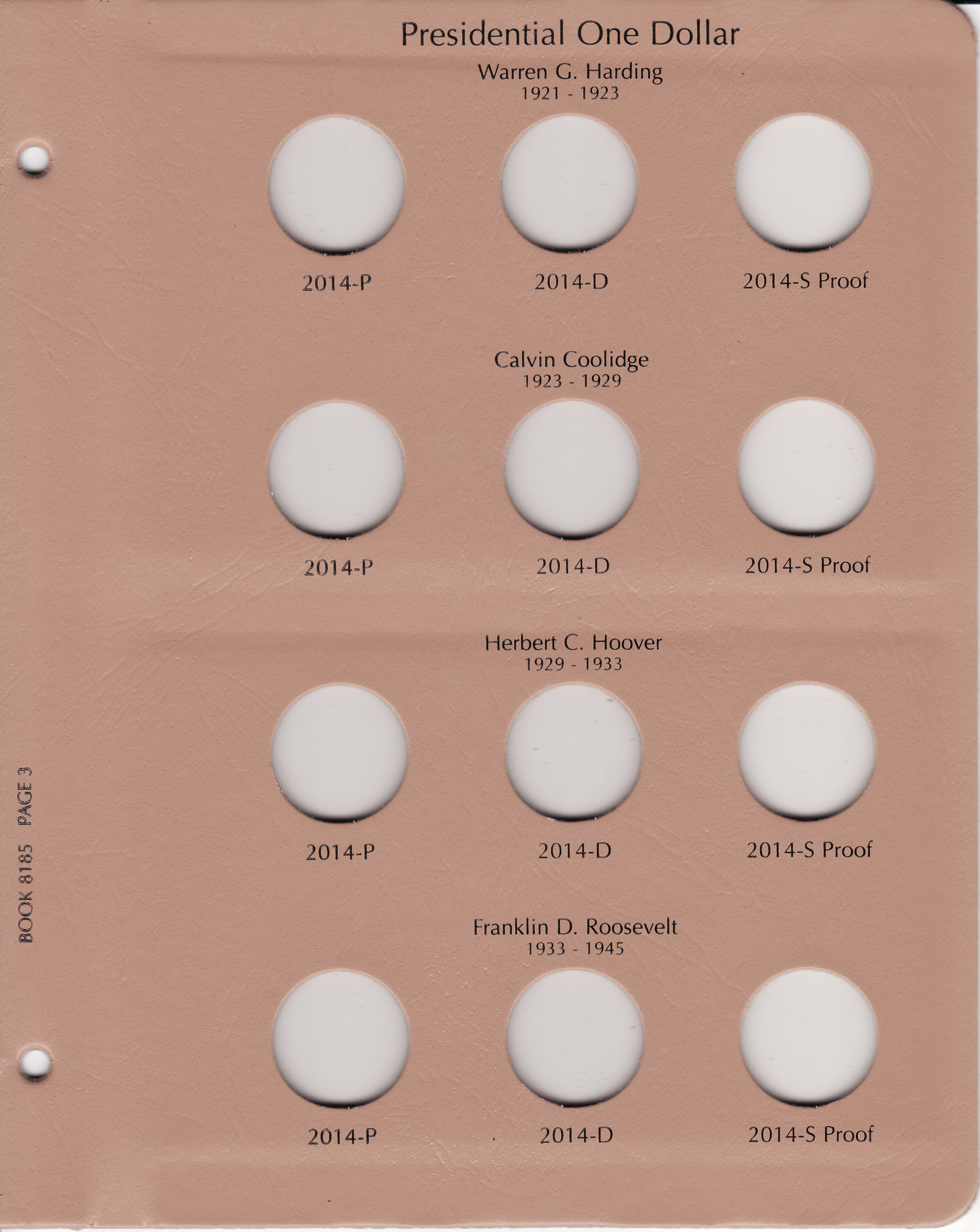 Dansco Replacement pages are used to update older versions of albums or replace worn pages. This page holds Presidential Dollars from 2014 and replaces page 3 in Dansco Album 8185: Presidential Dollars w/ Proofs, 2012-2016. The page has 12 ports for coins from Philadelphia (P mintmark), Denver (D mintmark) and San Fransico (S mintmark proof) for each of the four presidents honored on the 2014 Presidential Dollars (Warren G. Harding, Calvin Coolidge, Herbert C. Hoover and Franklin D. Roosevelt).