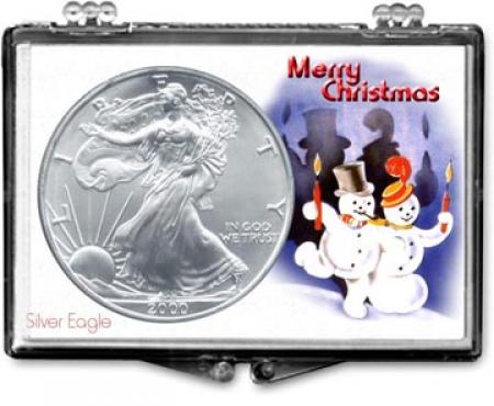 Edgar Marcus Snaplock Holders are made in the USA from high quality, crystal clear polystyrene. Each holder includes a cardboard insert featuring unique and beautiful artwork. The insert is hole-punched the perfect size to hold a coin relevant to the artwork. These holders are great for gift giving, rewards and storing and displaying collectible coins. This ''Christmas'' themed holder has a Snowmen illustration and is designed to hold a Silver Eagle coin. Coins shown in the picture are for illustration purposes only and are not included.