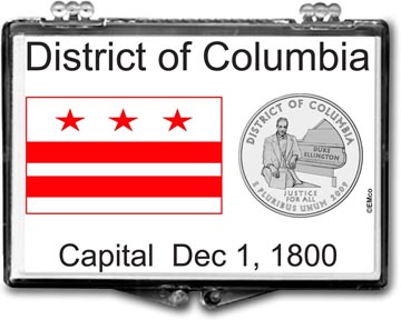 Edgar Marcus Snaplock Holders are made in the USA from high quality, crystal clear polystyrene. Each holder includes a cardboard insert featuring unique and beautiful artwork. The insert is hole-punched the perfect size to hold a coin relevant to the artwork. These holders are great for gift giving, rewards and storing and displaying collectible coins. This holder is designed to hold a District of Columbia state (or national park) quarter. The artwork on the holder includes the District of Columbia flag and the date District of Columbia became a the capital. Coins shown in the picture are for illustration purposes only and are not included.