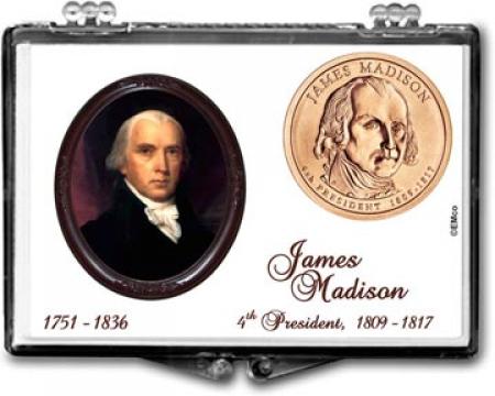 Edgar Marcus Snaplock Holders are made in the USA from high quality, crystal clear polystyrene. Each holder includes a cardboard insert featuring unique and beautiful artwork. The insert is hole-punched the perfect size to hold a coin relevant to the artwork. These holders are great for gift giving, rewards and storing and displaying collectible coins. This holder is designed to hold a James Madison presidential dollar. The artwork includes a portrait of James Madison, the order in which he was president, the years he served as president and the years of his birth and death. Coins shown in the picture are for illustration purposes only and are not included.