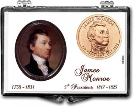 Edgar Marcus Snaplock Holders are made in the USA from high quality, crystal clear polystyrene. Each holder includes a cardboard insert featuring unique and beautiful artwork. The insert is hole-punched the perfect size to hold a coin relevant to the artwork. These holders are great for gift giving, rewards and storing and displaying collectible coins. This holder is designed to hold a James Monroe presidential dollar. The artwork includes a portrait of James Monroe, the order in which he was president, the years he served as president and the years of his birth and death. Coins shown in the picture are for illustration purposes only and are not included.