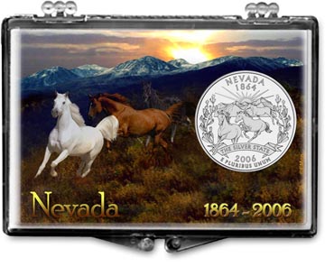 Edgar Marcus Snaplock Holders are made in the USA from high quality, crystal clear polystyrene. Each holder includes a cardboard insert featuring unique and beautiful artwork. The insert is hole-punched the perfect size to hold a coin relevant to the artwork. These holders are great for gift giving, rewards and storing and displaying collectible coins. This holder is designed to hold a Nevada state (or national park) quarter and features ''Horses'' artwork. Coins shown in the picture are for illustration purposes only and are not included.