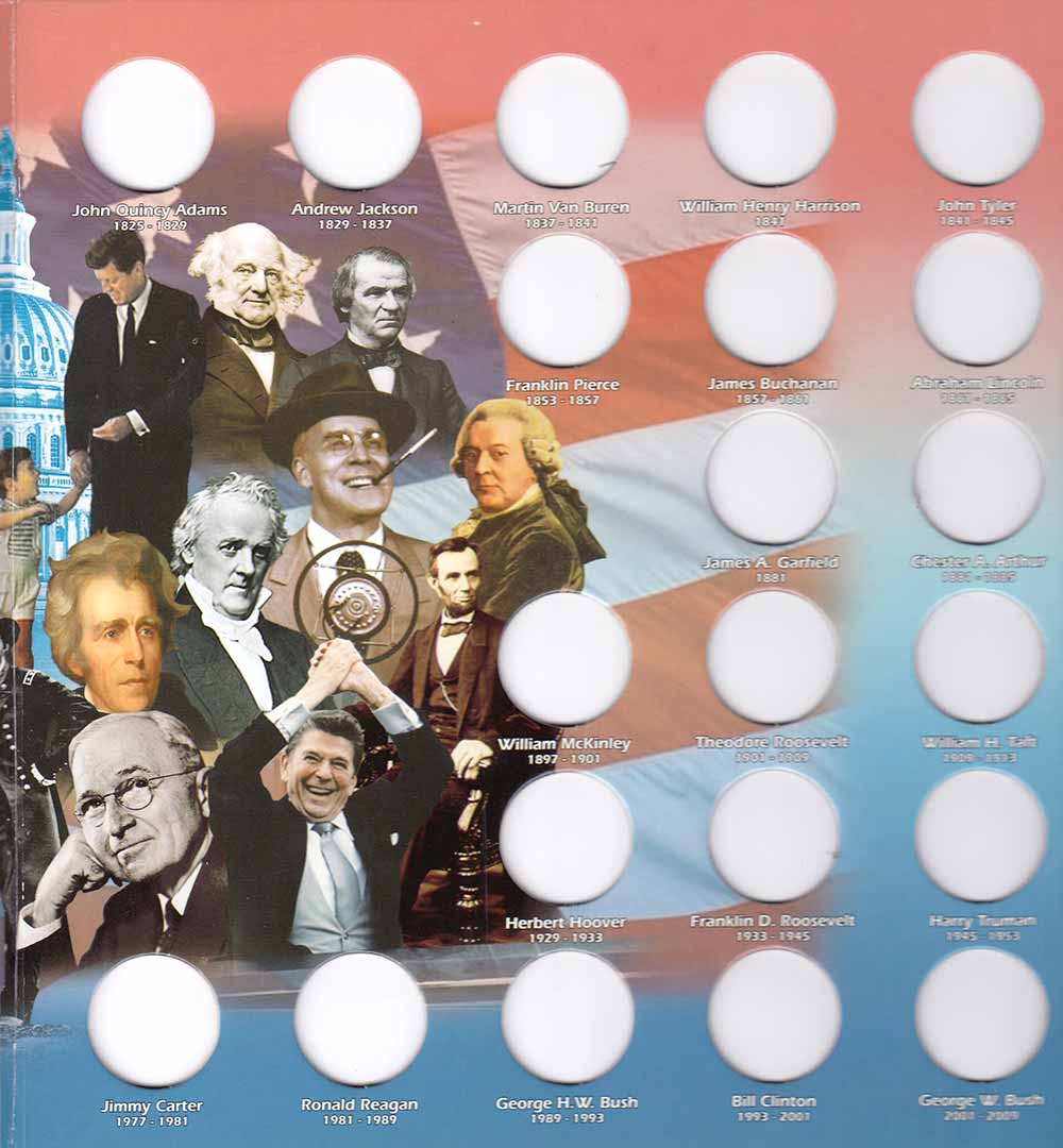 In 2007, the U.S. Mint introduced the new Presidential Dollar Coin Series, an extensive collection that celebrates each non-living U.S. President on a unique golden Dollar coin. Millions of collectors will collect the coins, and this album is the perfect way to organize and store your collection. Includes spaces for 43 coins (one for each President).