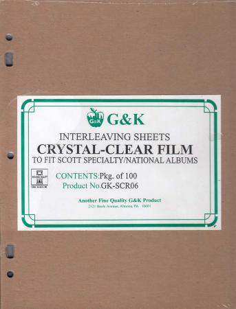 G&K Interleaving made of crystal-clear film to fit Scott's National or Specialty Series Albums. The interleaves have been punched to fit both the 2 post and 3 ring formats. Package of 100 interleaves.
