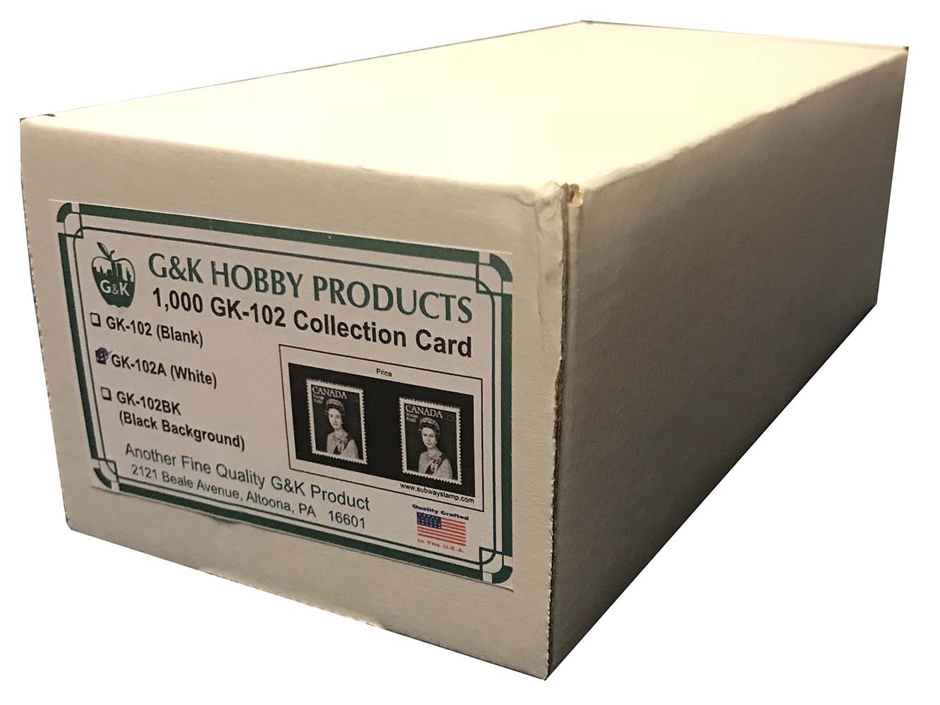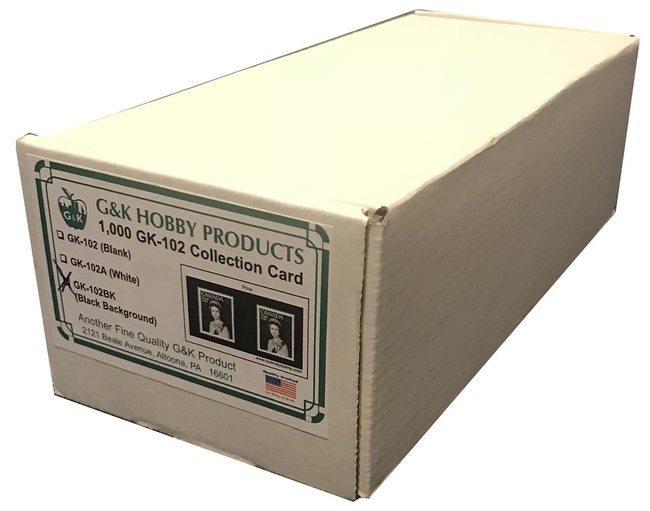 G&K dealer cards are less expensive than glassine envelopes and last much longer. Made of acid-free card stock and printed with crisp, non-smear ink they are an ideal way to store and present stamp inventory. The crystal clear film pocket holding the stamp is archival quality. Buy matching size storage boxes and divider cards to complete the system. Sold in boxes of 1000 cards.
