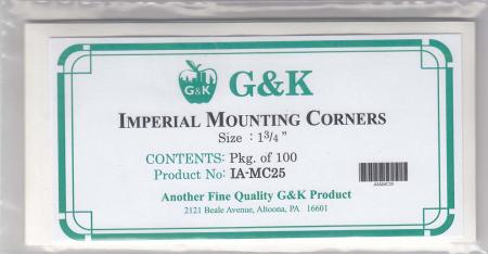 G&K Imperial Mounting Corners are fully transparent with invisible seams. The are made of crystal clear polypropolene film with permanent self stick acrylic (archival) adhesive. Sold in packs of 100 corners.
