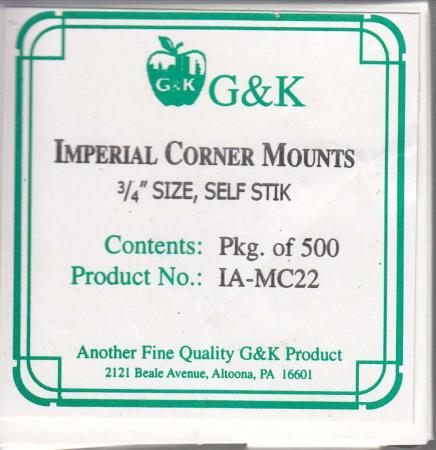 G&K Imperial Mounting Corners are fully transparent with invisible seams. The are made of crystal clear polypropolene film with permanent self stick acrylic (archival) adhesive. Sold in packs of 500 corners.