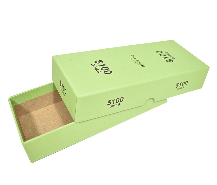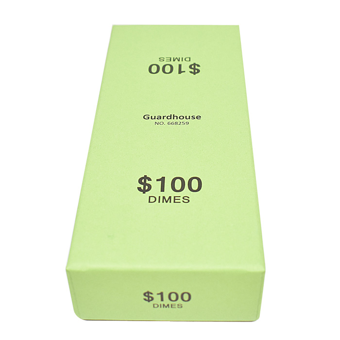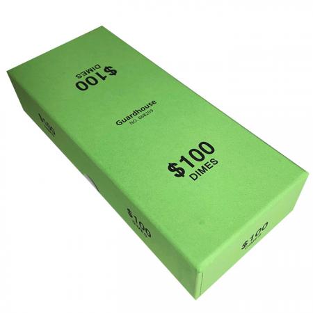 This heavy duty chipboard storage box is designed for paper-wrapped rolls of coins. The box holds $100 (20 rolls) of dimes in paper wrappers. The boxes are color coded by denomination using the American Banking Association standard colors.