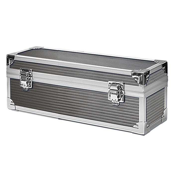 The exterior showcases a graphite ribbed finish, complemented by reinforced silver-toned metal corners and edges for a sleek, professional appearance. Inside the lid, a felt-like lining enhances the overall aesthetic. A dual latch keeps the lid securely closed, making this box perfect for collectors who value both portability and organized presentation at home.