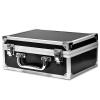 The exterior showcases a black diamond textured finish, complemented by reinforced silver-toned metal corners and edges for a sleek, professional appearance. Inside the lid, a felt-like lining enhances the overall aesthetic. A dual latch keeps the lid securely closed, and built-in legs allow the box to stand upright, making this box perfect for collectors who value both portability and organized presentation at home.