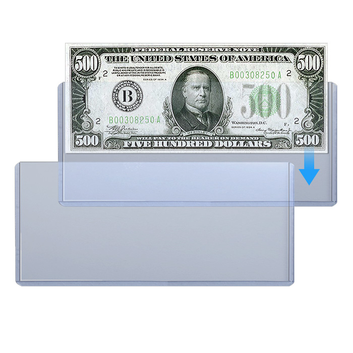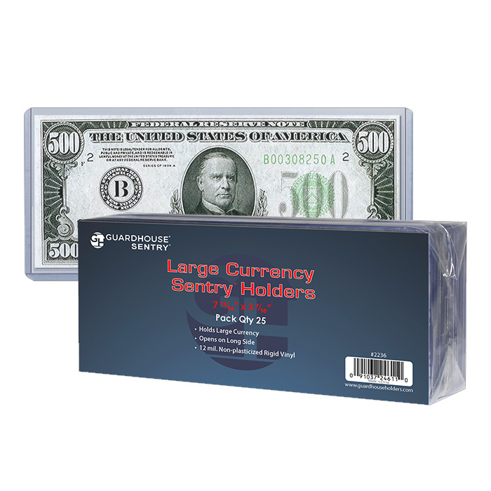 Guardhouse Modern Currency Sentry Holders are essential when collecting currency. Sold in packs of 25, Guardhouse Sentry holders for large currency are 12 mil thick and measure 3 1/4 x 7 1/2 inside, while the outside measures 3 7/16 x 7 13/16 inches. Guardhouse Sentry holders are made of non-plasticized rigid vinyl and are designed to keep currency bills unharmed during long-term storage, at the same time as offering the collector great visibility of their bills.