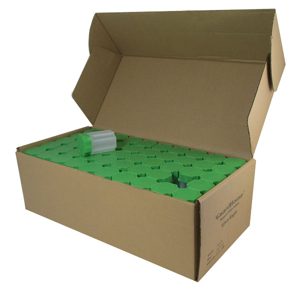 Guardhouse tubes feature a snap-tight lid that fits snugly and securely, yet comes off easily with a simple twist and pull. These tubes are translucent and you can see what’s inside, from the top, bottom and side of the tube, allowing you to quickly identify the contents and correct quantity. Thumb notches on the lid make it easy to remove an individual tube from within a group of tightly packed tubes. Ledges built into the base and lid make for easy vertical stacking. Fits comfortably in your hand. No sharp corners or edges. The American Silver Eagle tubes fit perfectly into the U.S. Mint monster box. Sold individually or in cases of 100 tubes.
