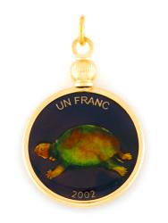 Each piece in our line of hand painted coin and medallion jewelry is crafted from a genuine coin or medallion. The multi-color hand painting comes from a very old art form from a family of artists. This family is the only known family of artists in the United States making these beautiful pieces, each of which is a gift or keepsake to treasure forever. The artists of this family have carefully selected each coin and medallion and, choosing from a selection of miniature curved and straight brushes, hand painted every minute detail that already existed on the coin or medallion. In painstaking fashion, the artists have applied color initially to the background to outline the design, followed by a high tempature firing process. The firing process is repeated after each color is applied. The hand-painting process for each piece varies with some taking as long as two days to complete. In the final stage, in order to protect the delicate hand painting, the artists have applied and baked on a covering of space age plastic, which also adds depth and luster to the item while providing protection forever.