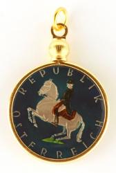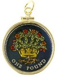 Each piece in our line of hand painted coin and medallion jewelry is crafted from a genuine coin or medallion. The multi-color hand painting comes from a very old art form from a family of artists. This family is the only known family of artists in the United States making these beautiful pieces, each of which is a gift or keepsake to treasure forever. The artists of this family have carefully selected each coin and medallion and, choosing from a selection of miniature curved and straight brushes, hand painted every minute detail that already existed on the coin or medallion. In painstaking fashion, the artists have applied color initially to the background to outline the design, followed by a high tempature firing process. The firing process is repeated after each color is applied. The hand-painting process for each piece varies with some taking as long as two days to complete. In the final stage, in order to protect the delicate hand painting, the artists have applied and baked on a covering of space age plastic, which also adds depth and luster to the item while providing protection forever.