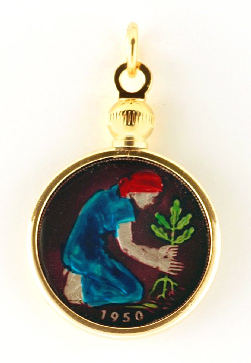 Hand Painted Germany 50 Pfenning Planting Lady Pendant