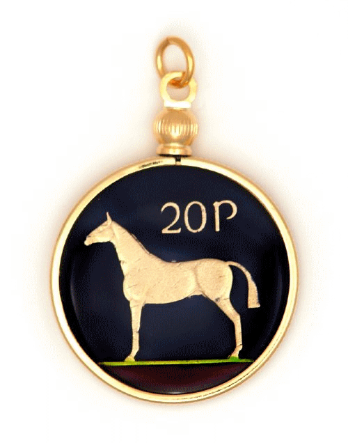 Each piece in our line of hand painted coin and medallion jewelry is crafted from a genuine coin or medallion. The multi-color hand painting comes from a very old art form from a family of artists. This family is the only known family of artists in the United States making these beautiful pieces, each of which is a gift or keepsake to treasure forever. The artists of this family have carefully selected each coin and medallion and, choosing from a selection of miniature curved and straight brushes, hand painted every minute detail that already existed on the coin or medallion. In painstaking fashion, the artists have applied color initially to the background to outline the design, followed by a high tempature firing process. The firing process is repeated after each color is applied. The hand-painting process for each piece varies with some taking as long as two days to complete. In the final stage, in order to protect the delicate hand painting, the artists have applied and baked on a covering of space age plastic, which also adds depth and luster to the item while providing protection forever.