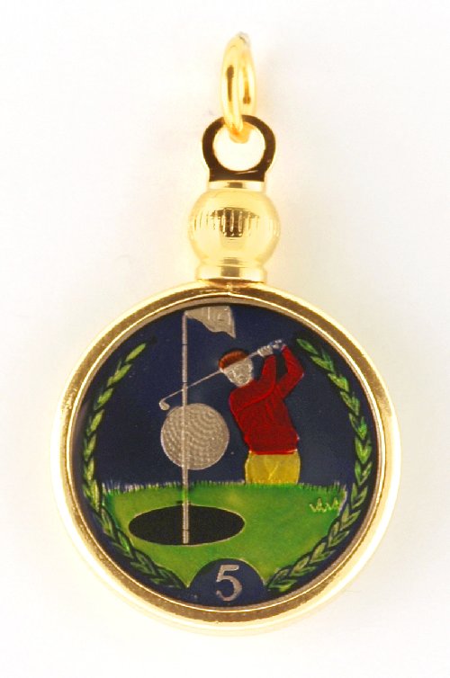 Hand Painted Isle of Man 5 Pence Golfer Pendant