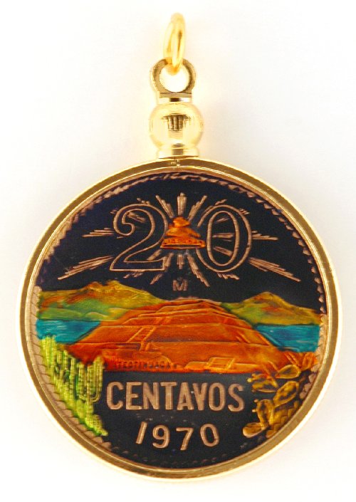 Hand Painted Mexico 20 Centavos Mountains and Temple Pendant