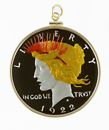 Each piece in our line of hand painted coin and medallion jewelry is crafted from a genuine coin or medallion. The multi-color hand painting comes from a very old art form from a family of artists. This family is the only known family of artists in the United States making these beautiful pieces, each of which is a gift or keepsake to treasure forever. The artists of this family have carefully selected each coin and medallion and, choosing from a selection of miniature curved and straight brushes, hand painted every minute detail that already existed on the coin or medallion. In painstaking fashion, the artists have applied color initially to the background to outline the design, followed by a high tempature firing process. The firing process is repeated after each color is applied. The hand-painting process for each piece varies with some taking as long as two days to complete. In the final stage, in order to protect the delicate hand painting, the artists have applied and baked on a covering of space age plastic, which also adds depth and luster to the item while providing protection forever.