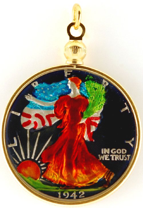 Each piece in our line of hand painted coin and medallion jewelry is crafted from a genuine coin or medallion. The multi-color hand painting comes from a very old art form from a family of artists. This family is the only known family of artists in the United States making these beautiful pieces, each of which is a gift or keepsake to treasure forever. The artists of this family have carefully selected each coin and medallion and, choosing from a selection of miniature curved and straight brushes, hand painted every minute detail that already existed on the coin or medallion. In painstaking fashion, the artists have applied color initially to the background to outline the design, followed by a high tempature firing process. The firing process is repeated after each color is applied. The hand-painting process for each piece varies with some taking as long as two days to complete. In the final stage, in order to protect the delicate hand painting, the artists have applied and baked on a covering of space age plastic, which also adds depth and luster to the item while providing protection forever.